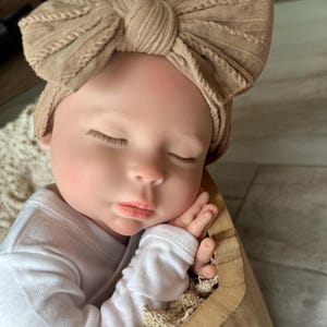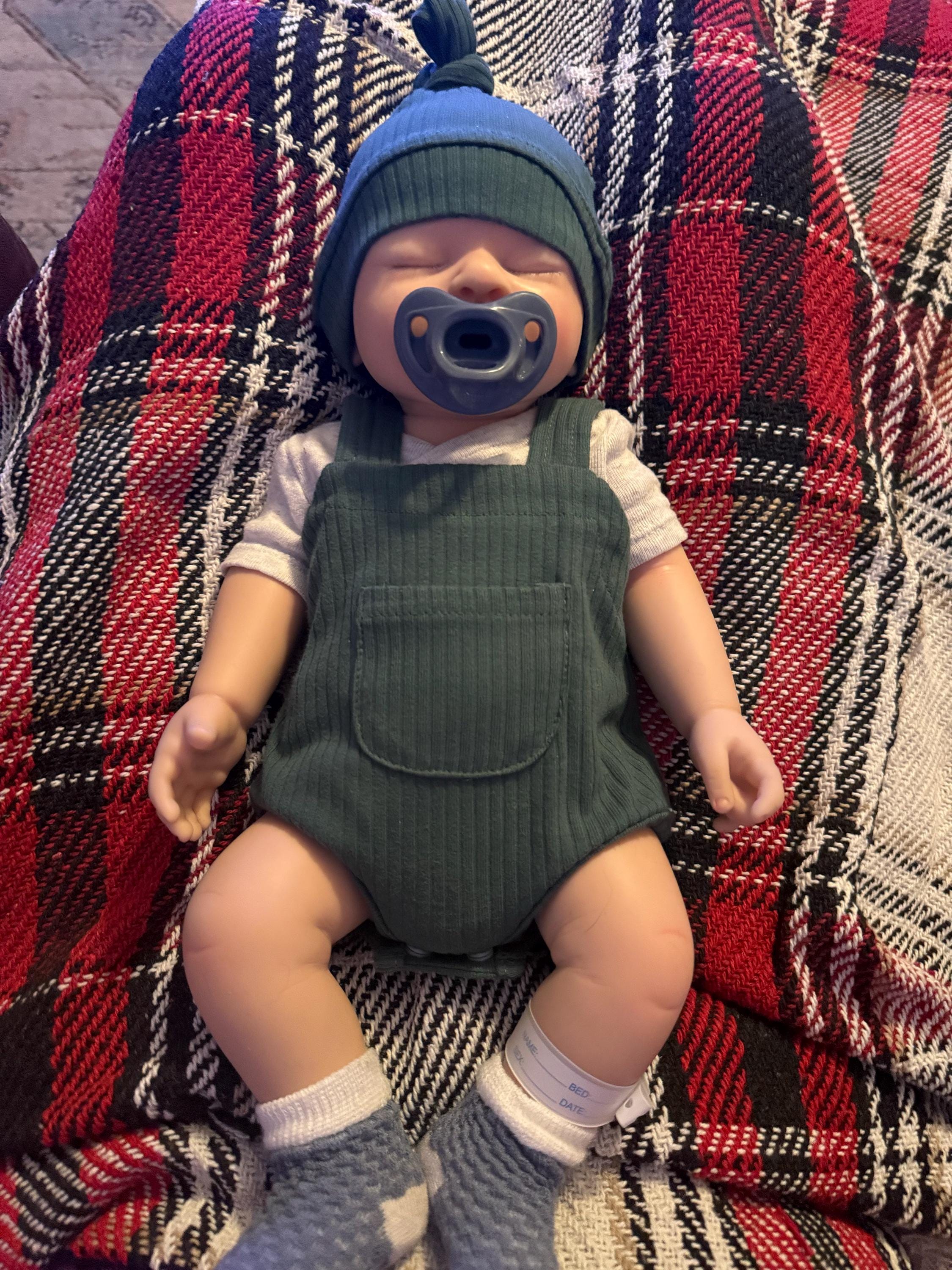 Asleep Preston is precious white baby boy, ready to meet his new parents! He has been beautifully painted, giving him a realistic skin tone. He has adorable little leg creases and veins and blushing painted on his skin. He has rooted eye lashes. His mouth is open and he can take a pacifier perfectly. He does not drink and wet (bottle feeding is pretend). He is made from Platinum silicone and weighs 5.8 lbs, measuring 18 inches long. He fits preemie-sized clothing perfectly.