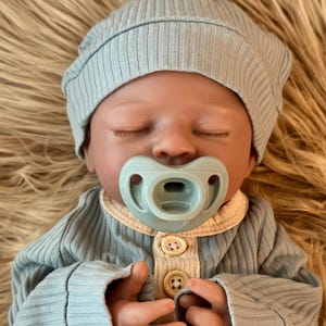 Here is precious baby Mila (brown skin tone), ready to meet her new parents! She has been beautifully painted, giving her a realistic skin tone. I would call her skin tone Hispanic or light brown. She has rooted eye lashes. Her mouth is functional so she can take a pacifier. Mila is made from Platinum silicone and weighs 7.6 lbs, measuring 19 inches long. She fits newborn-sized and some 0-3 mo clothing perfectly.