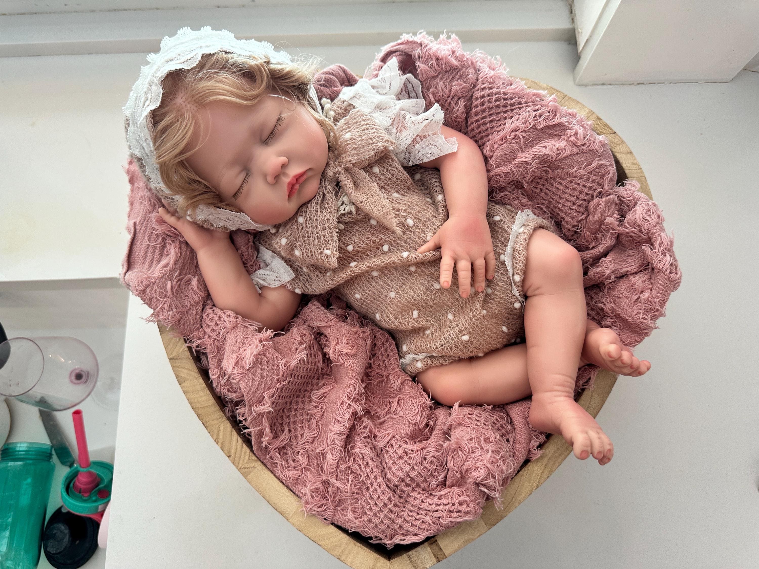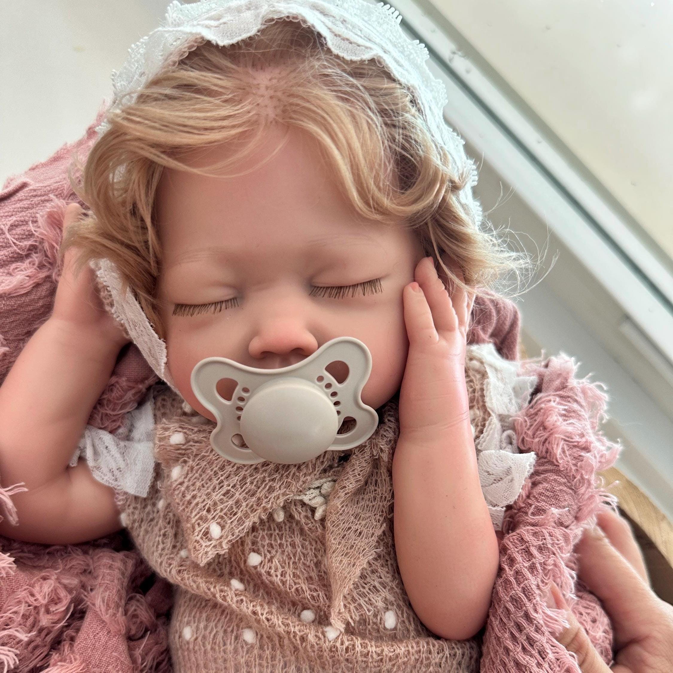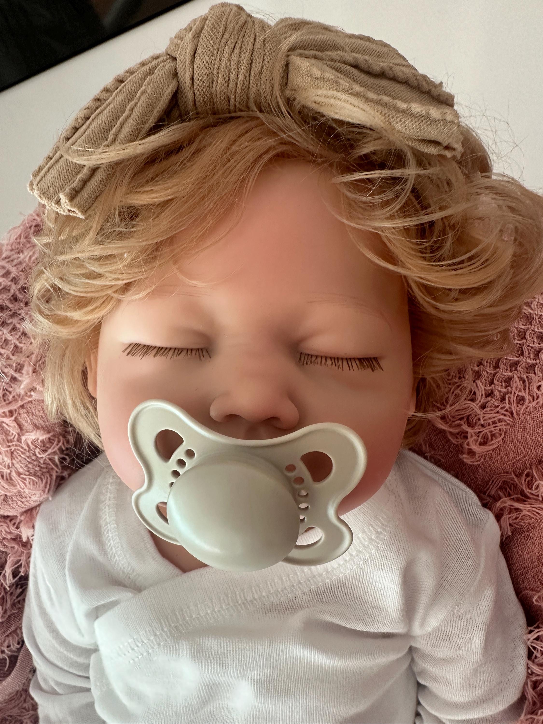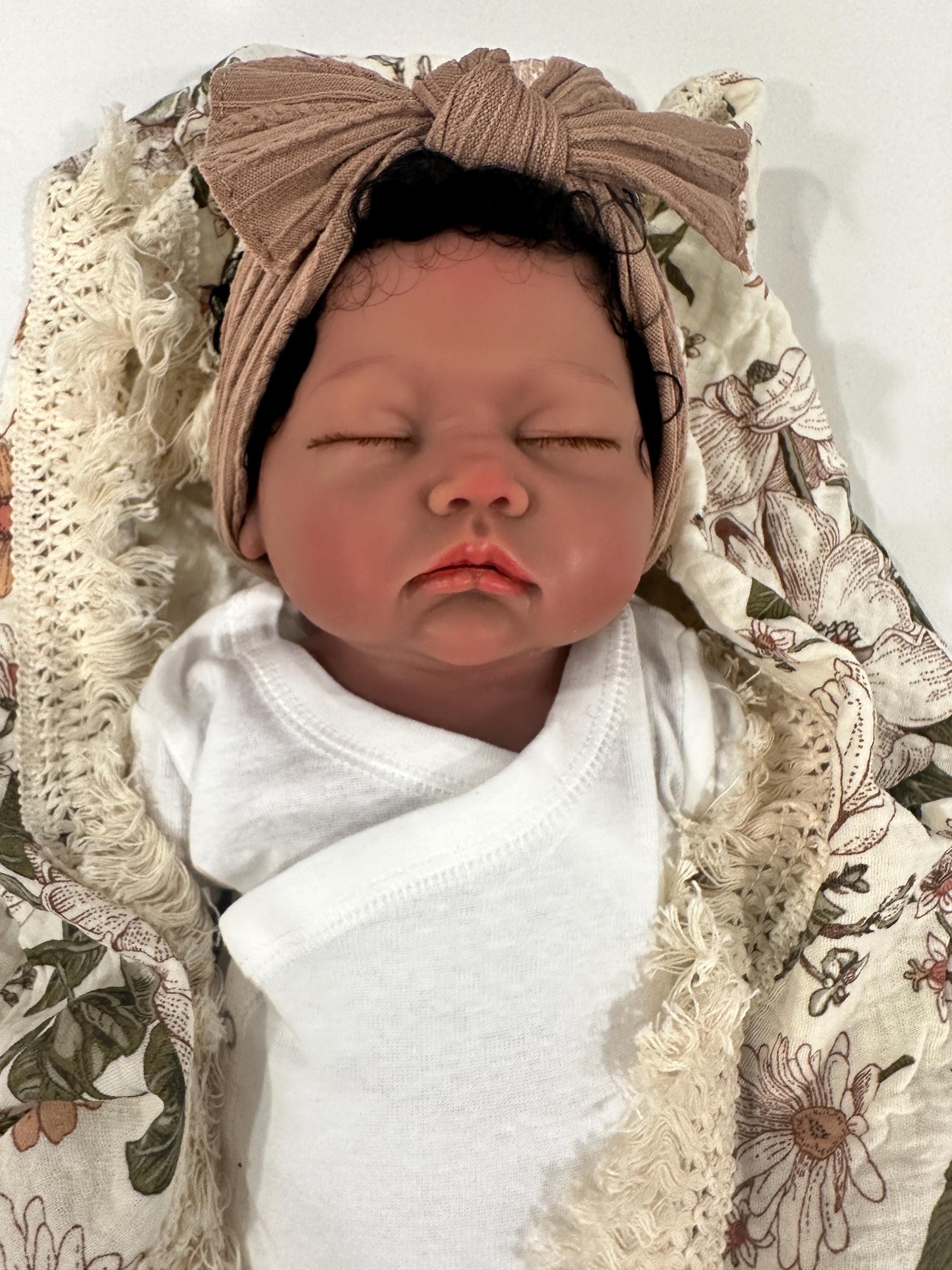 Stunning asleep Charlotte with hair is a precious baby girl, ready to meet her new parents! She is available as a white baby with strawberry blonde hair or as a brown skin baby with black hair. Seriously though, look at her head of hair! She has been beautifully painted, giving her a realistic skin tone. She has adorable little leg creases and veins and blushing painted on her skin. She has rooted eye lashes and a head full of machine rooted hair. Her mouth has been opened and she can take a modified pacifier perfectly. What is a modified pacifier?- I have cut the tip off of a real pacifier to make it easier to insert into the baby's mouth. I prefer that you do not have to stretch the mouth open too far as that could risk damage to the corner's of her mouth.