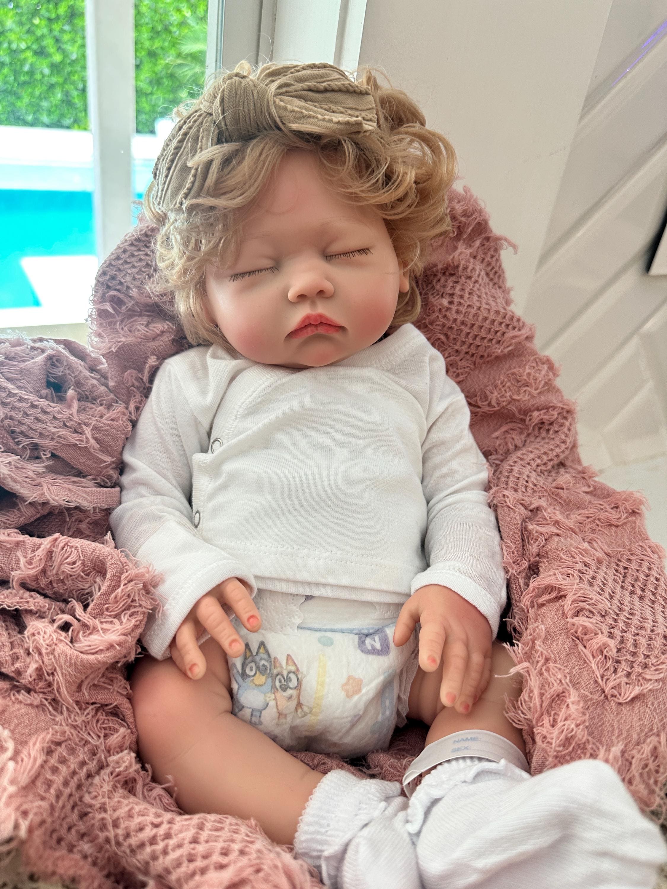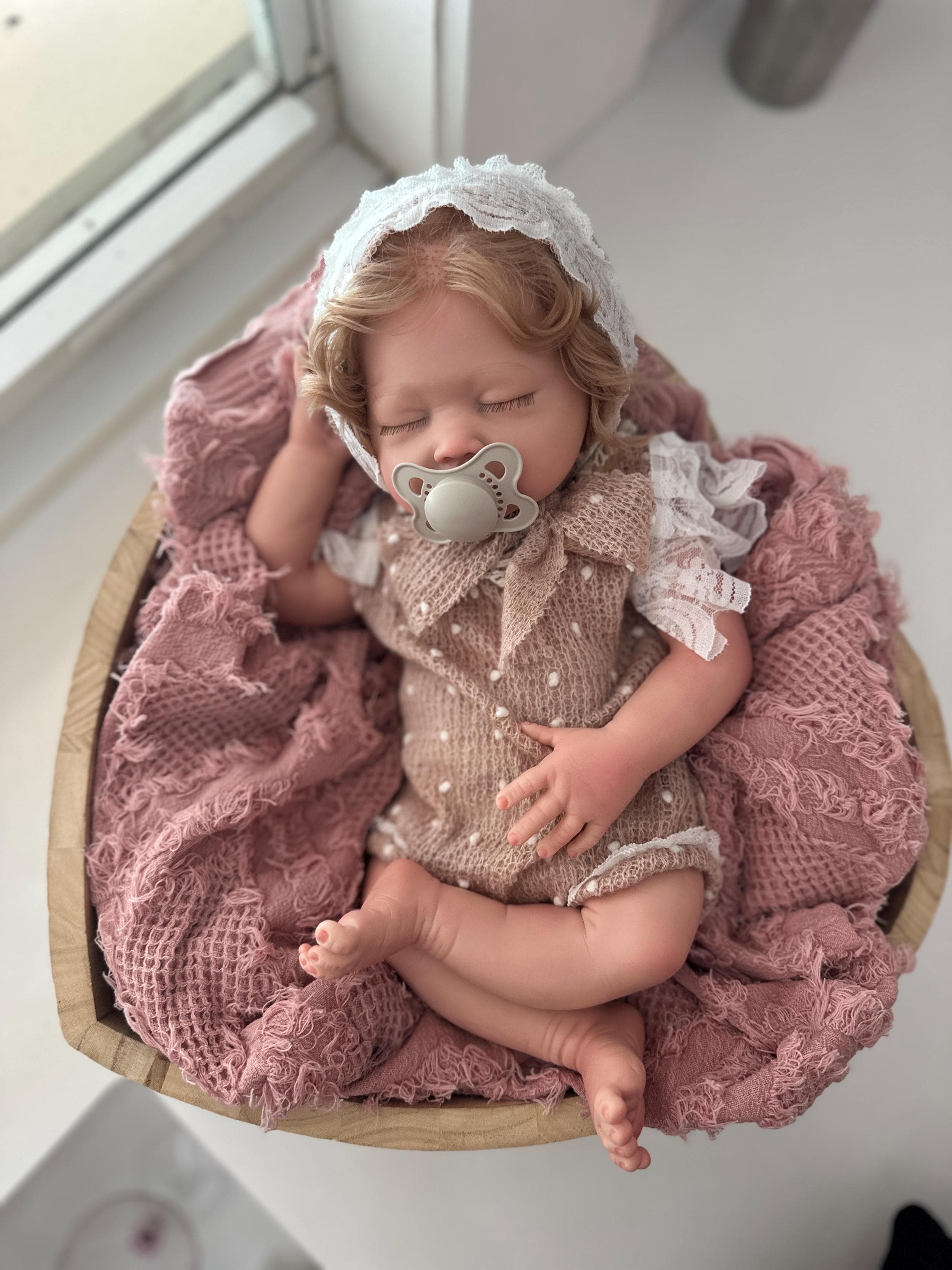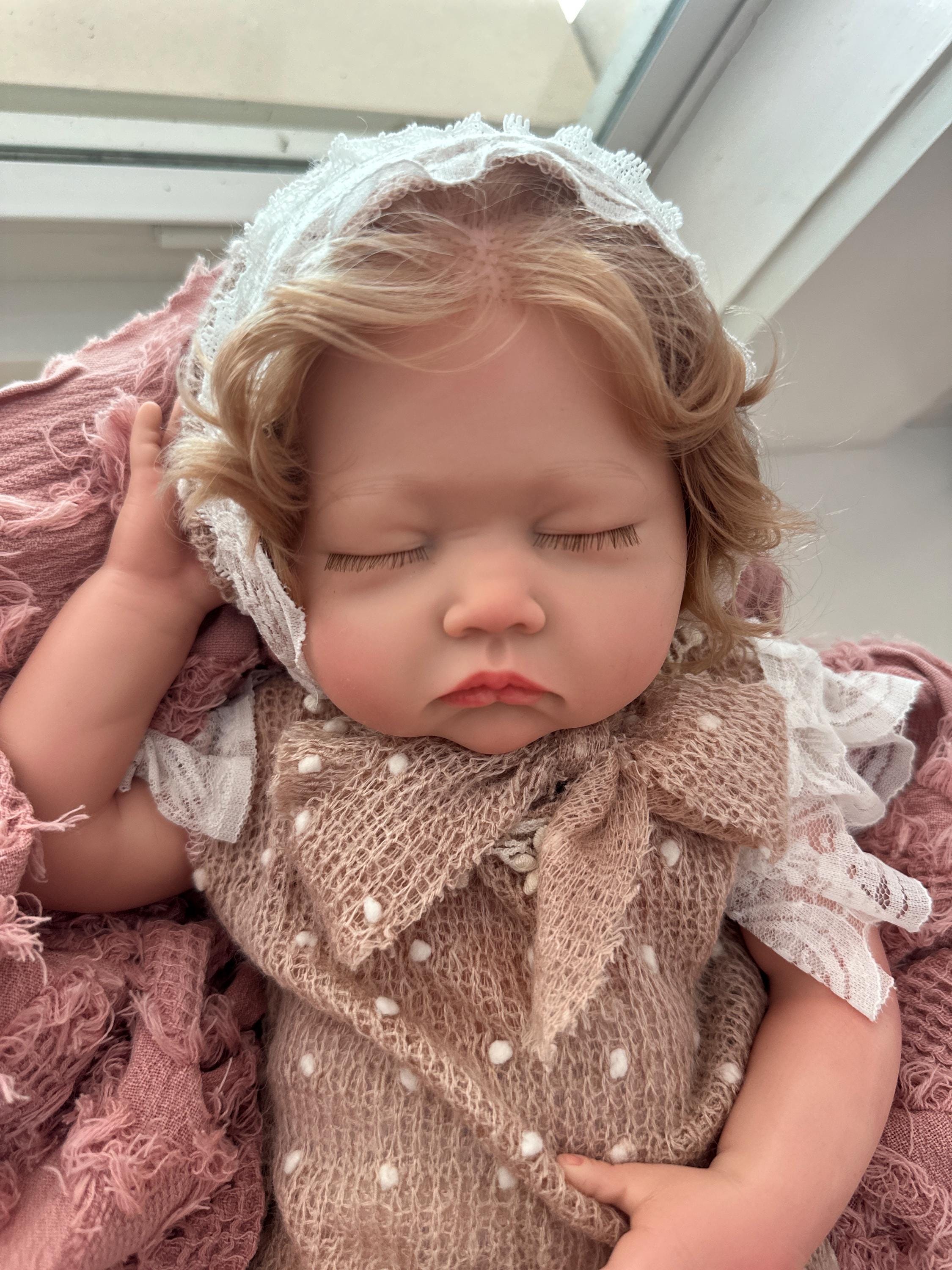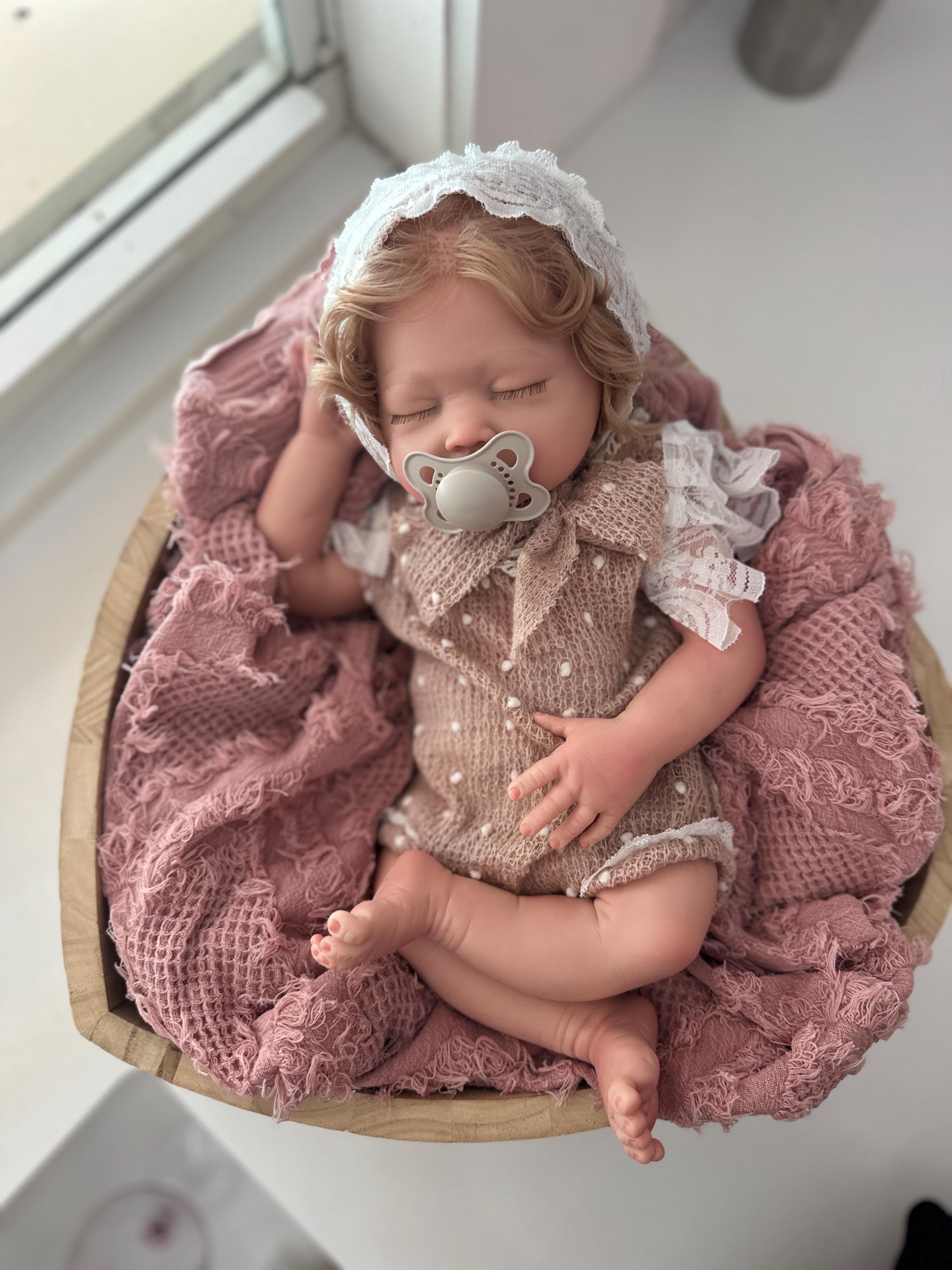 Stunning asleep Charlotte with hair is a precious baby girl, ready to meet her new parents! She is available as a white baby with strawberry blonde hair or as a brown skin baby with black hair. Seriously though, look at her head of hair! She has been beautifully painted, giving her a realistic skin tone. She has adorable little leg creases and veins and blushing painted on her skin. She has rooted eye lashes and a head full of machine rooted hair. Her mouth has been opened and she can take a modified pacifier perfectly. What is a modified pacifier?- I have cut the tip off of a real pacifier to make it easier to insert into the baby's mouth. I prefer that you do not have to stretch the mouth open too far as that could risk damage to the corner's of her mouth.