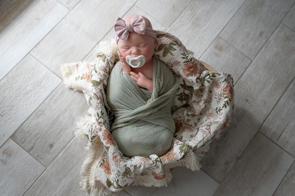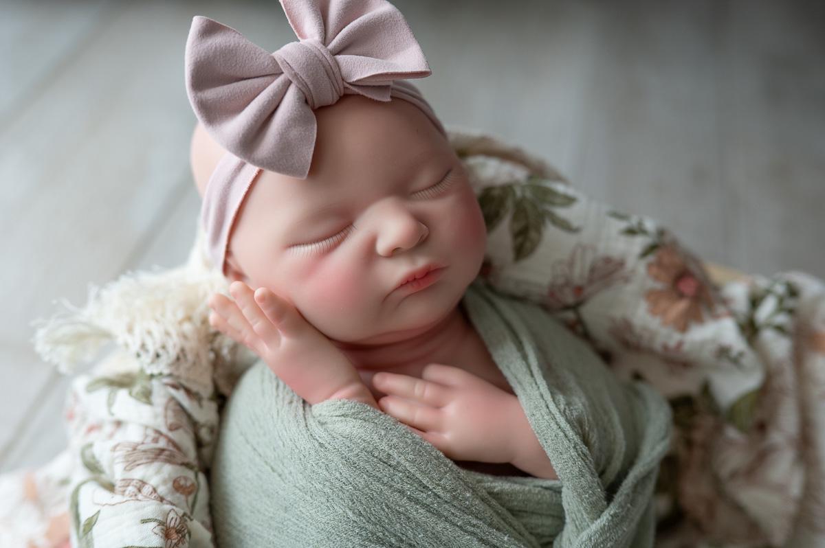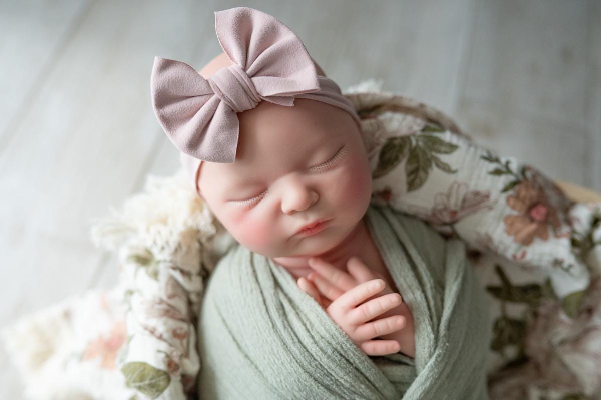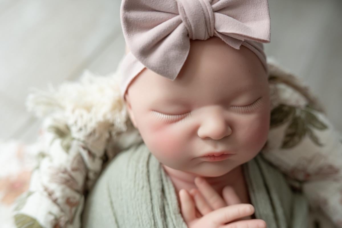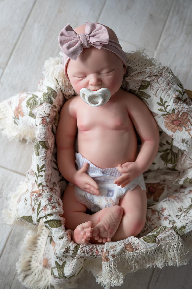 Sweet little asleep Olivia is precious baby girl, ready to meet her new parents! She is available in light skin and has been beautifully painted, giving her a realistic skin tone. She has adorable little leg creases and veins and blushing painted on her skin. She has rooted eye lashes. Her mouth has been opened and she can take a modified pacifier perfectly. What is a modified pacifier?- I have cut the tip off of a real pacifier to make it easier to insert into the baby's mouth. I prefer that you do not have to stretch the mouth open too far as that could risk damage to the corner's of her mouth.