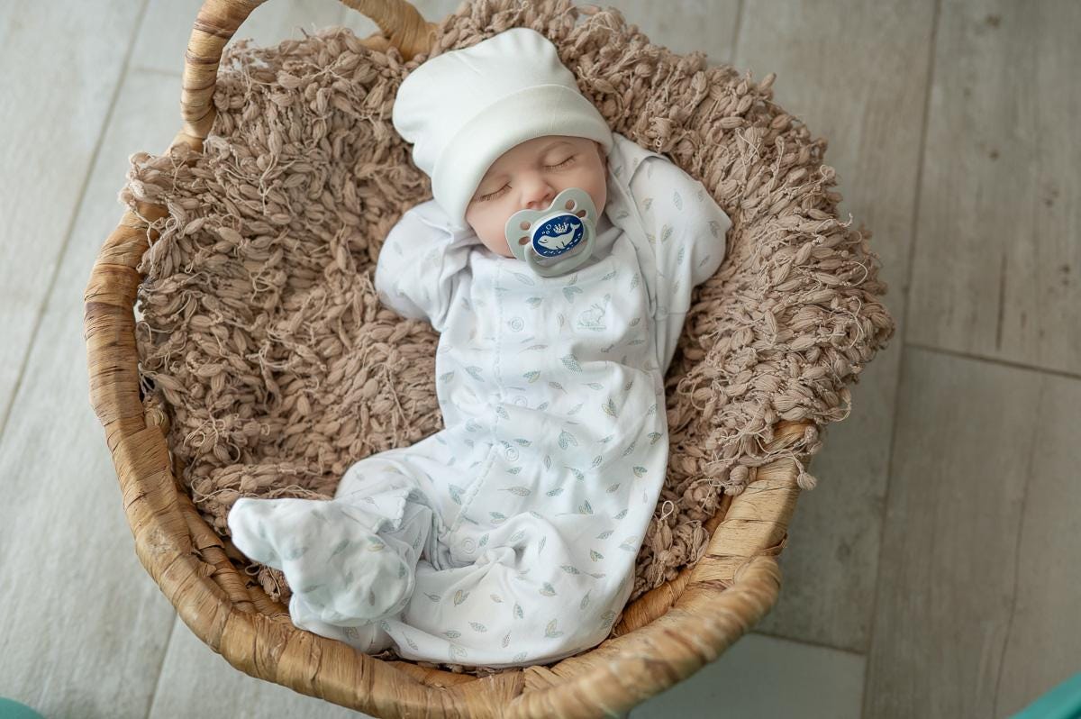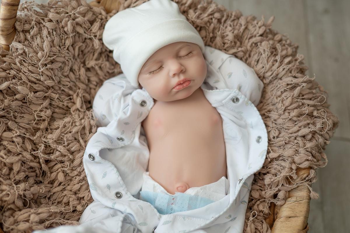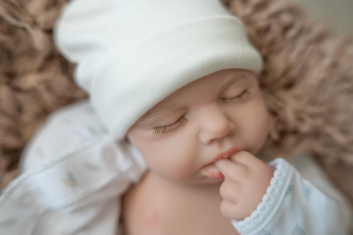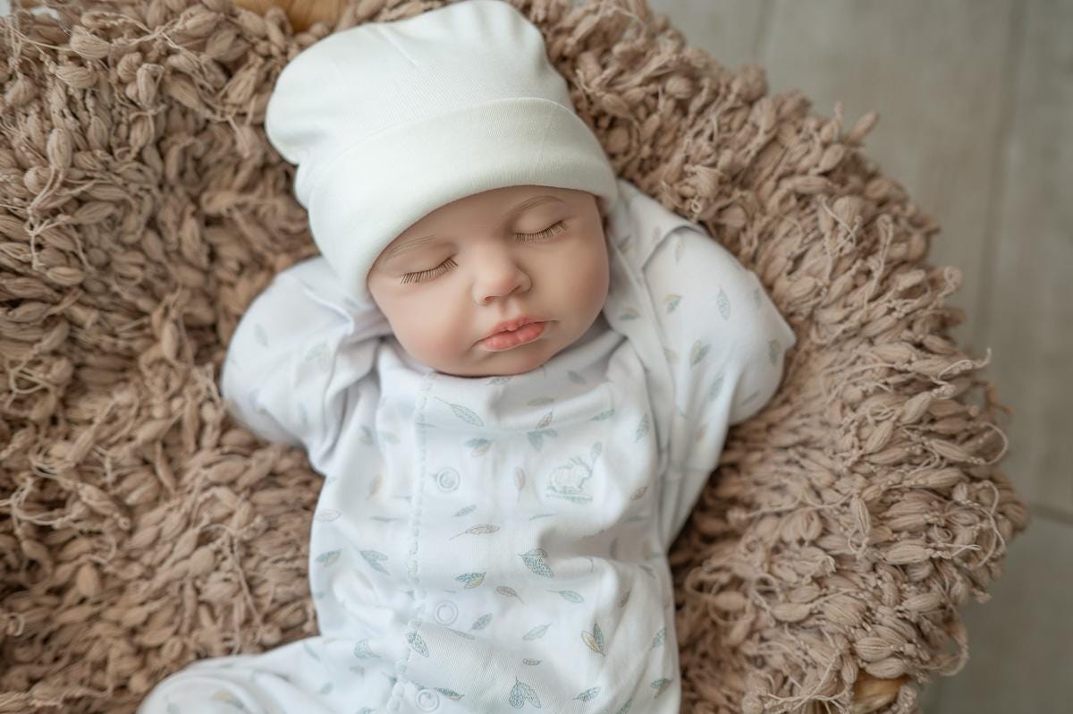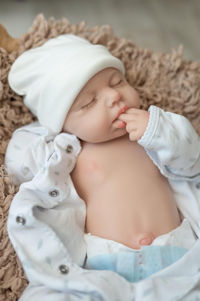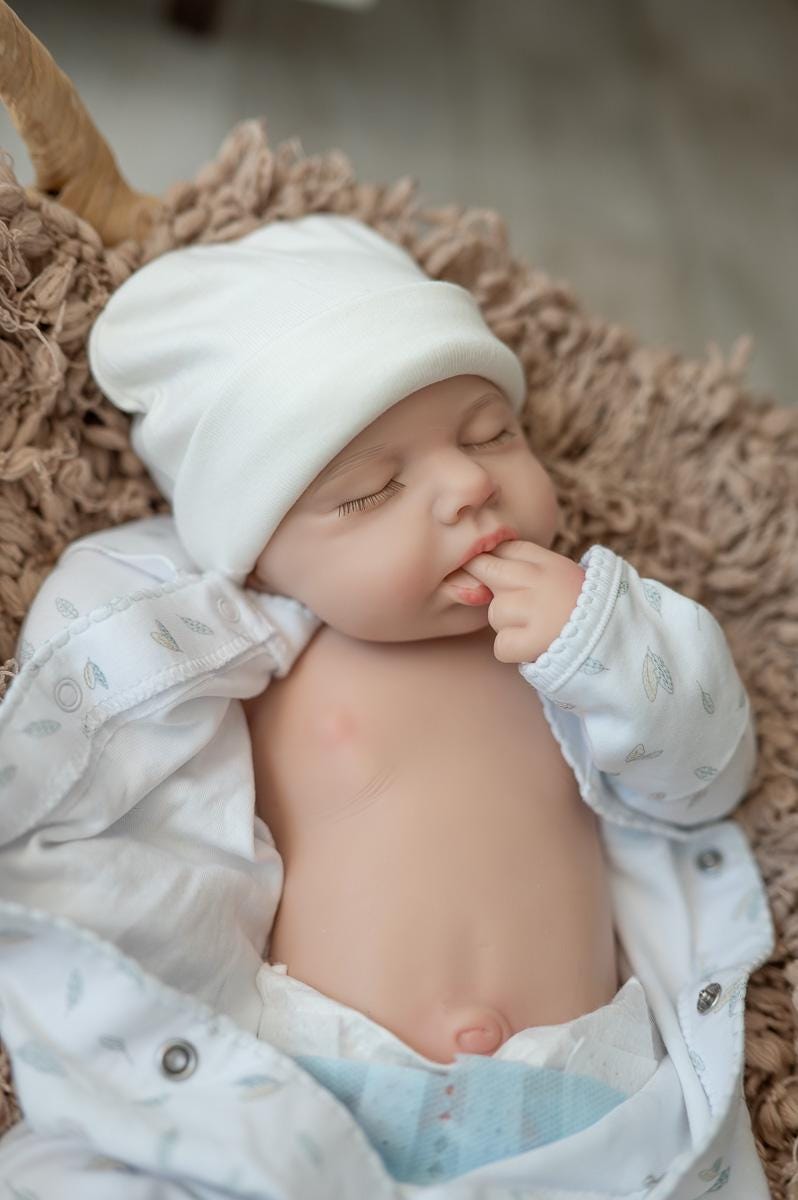 Asleep Asher is a precious white baby boy, ready to meet his new parents! He has been beautifully painted, giving him a realistic skin tone. He has adorable little leg creases and veins and blushing painted on his skin. He has rooted eye lashes. His mouth has been opened and he can take a modified pacifier. What is a modified pacifier?- I have cut the tip off of a real pacifier to make it easier to insert into the baby's mouth. I prefer that you do not have to stretch the mouth open too far as that could risk damage to the corner's of her mouth.
